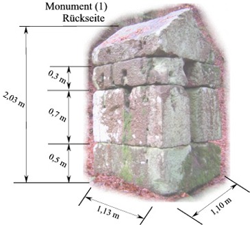 Das linke talseitige Monument (nachfolgend als "Monument 1" bezeichnet) hat im Grundriss die Maße 1,13 Meter auf 1,10 Meter. Das rechte bergseitige Monument (nachfolgend als "Monument 2" bezeichnet) hat im Grundriss die Maße 1,30 Meter auf 1,10 Meter. Wobei der oberste Dachstein abweichend vom Grundriss die Maße 1,10 Meter auf 0,90 Meter aufweist. |