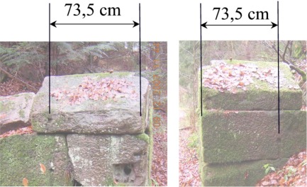 Verblüffend ist der Umstand, dass die hintere Nutbehauung des Dachsteinblocks mittig einen Abstand zur Vorderkante von exakt 73,5 cm hat. Ebenso beträgt der mittige Abstand zur Vorderkante 73,5 cm beim zweiten oberen Stein auf der anderen Unterseite. Der Verlauf der Nutbehauung ist hier jedoch nach unten. Bei einer Drehung des von oben zweiten Steins um 180 °, würde diese Nutbehauung nach oben verlaufen und wäre fluchtend mit der Behauung des Dachsteins. Ausgehend von diesen Feststellungen ist es als eindeutig anzusehen, dass die Gesteinsaufschichtung nicht der ursprünglichen Beschaffenheit entspricht. Vielmehr dürfte der ursprüngliche Aufbau so gewesen sein, dass der zweite obere Steinblock um 180 ° gedreht war. An diesem Steinblock ist außerdem eine Vierkantbehauung vorhanden. Diese dürfte im ursprünglichen Zustand des Monuments somit nicht tal- sondern bergseitig gewesen sein. |